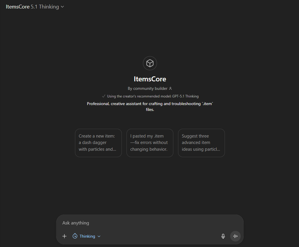 Need any help with your items? need quick modifications to your items? want suggestions? want a quick auto generated item using only a prompt?! Use the new Custom ChatGPT that has all the plugin data and will help you with everything you'd like!